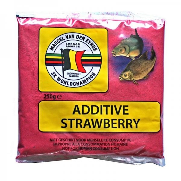 Een erg rijk additief met een sterke, aangenaam zoete strawberry geur. Strawberry kan in elk lokaas worden vermengd om het zoeter te maken en hierdoor de aantrekkingskracht ervan nog te vergroten zowel voor wat betreft smaak als geur. Verreweg de meeste vissers zouden niet eens op weg gaan zonder een of ander additief te hebben toegevoegd aan het lokaas dat ze hebben gekozen. De reden hiervoor is erg simpel. Men gelooft dat de gekozen toevoeging ervoor zorgt dat nog meer in de buurt rondzwemmende vissen naar de gekozen visplaats worden gelokt. Het geloof hierin vergroot het vertrouwen waarmee men het lokaas gebruikt en dit vertrouwen is het magische woord in onze sport. Poeder-additieven zijn de meest gebruikte toevoegingen aan lokaas. Ze zijn in allerlei soorten en types verkrijgbaar. De vaste stelregel is dat de inhoud van een zakje ruim voldoende is voor 4 tot 5 kilo droog lokaas, maar zoals gezegd is dit slechts een indicatie. De beste manier om poeder-additieven te gebruiken is om of de additieven op te lossen in het water waarmee U het lokaas bevochtigt of om de droge additieven simpelweg te mengen met het droge lokaas voordat U dit gaat bevochtigen.
