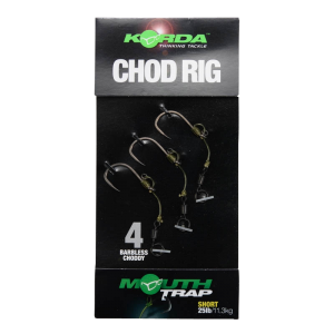 Korda Chod rigs zijn met zorg geknoopt van de beste materialen zoals, Korda Mouth Trap en Korda choddy componenten. Er is gebruik gemaakt van een speciale haakknoop, waardoor het onderlijnmateriaal precies op de juiste hoek het oog van de haak verlaat. Vervolgens is het onderlijnmateriaal precies de juiste vorm gegeven, waardoor dit één van de meest effectieve aaspresentaties is geworden in het moderne karper visserij. Wees er zeker van dat de rubberen kralen nat zijn gemaakt als je deze rig gebruikt. Het is immers erg belangrijk dat de rubberen kralen onder lichte druk gemakkelijk kunnen verschuiven. Hierdoor is de veiligheid van de karper gegarandeerd bij lijnbreuk. Gebruik een pop-up met voldoende drijfvermogen, hierdoor zal het aas tijdens de duur van de vissessie de Chod rig in de juiste positie kunnen houden. De Korda Chod rig kan eenvoudig gemaakt worden op de hoofdlijn, of door gebruik te maken van het Kable leadcore leader materiaal.