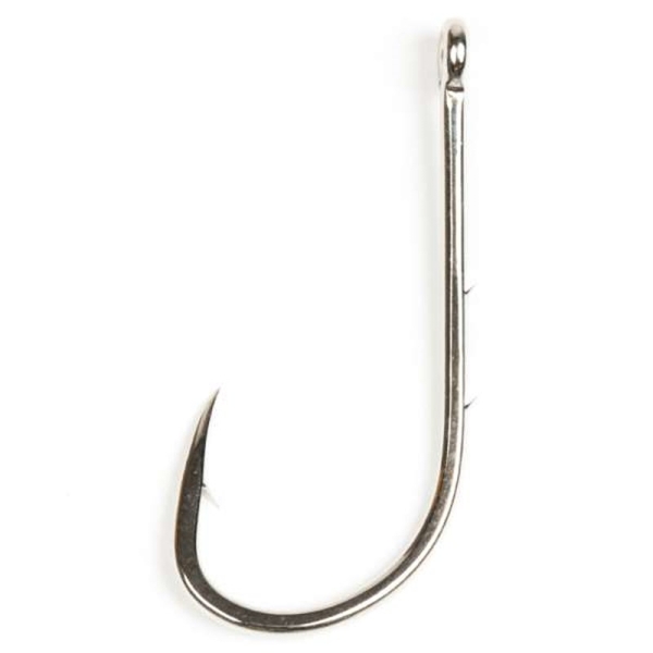 Vlijmscherpe Gamakatsu LS-5213 haak. Deze nikkelen haak heeft een lange steel met kleine weerhaakjes voor het vissen met wormen of bijvoorbeeld een kleine visfilet en dauwpieren.