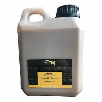 Digested Liver is een vloeibaar leverextract. Het wordt gebruikt in de petfood sector als acceptatieverbeteraar, dat wil zeggen honde- of kattebrokken worden ermee besprenkeld om zodoende de smaak te verbeteren. Hierdoor worden de brokken direct geaccepteerd als voedsel zijnde. Eén van de stoffen omschreven door Howard E. Loeb - een bioloog uit de Verenigde Staten - als karper attractor en daar heeft hij niet over gelogen. Vooral in vismeelrecepturen is vloeibare lever al jaren een betrouwbare factor. Het is rijk aan vitamine B-12 en staat bol van de vrije aminozuren. Deze onverdunde versie wordt gemaakt van maïskippenlevers. Hierdoor heeft de vloeistof een lichtbruine kleur, die karakteristieke leversmaak en penetrante onmiskenbare levergeur. Deze liquid van Mtc Baits word geleverd in een hqndige jerry-can met een inhoud van 1ltr.