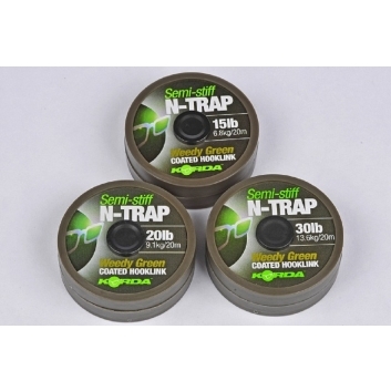 N-Trap Semi Stiff is een zeer betrouwbaar onderlijnmateriaal met een gemakkelijk te verwijderen matte coating, ideaal om geavanceerde combi rigs te maken. N-Trap Semi zit qua stijfheid precies tussen de N-Trap Soft en de later dit jaar op de markt komende Stiff onderlijnen in. N-Trap Semi Stiff voorkomt het in de war werpen en zorgt er tevens voor dat kritisch gebalanceerd haak-aas van het lood afgeduwd wordt. De gevlochten kern bestaat uit een speciaal type Dyneema met een zeer hoge trekkracht welke ook gebruikt wordt voor de ruimtevaart. N-Trap zal je daarom niet in de steek laten!