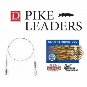 Snoek- en snoekbaars onderlijnen. Gemaakt van top kwaliteit staaldraad American Fishing wire Surfstrand. De Dragon AFW Surfstrand 7x7 Spinning leaders zijn soepel en extra dun in diameter daardoor vrijwel onzichtbaar onder water dus zeer geschikt om subtiel te verticalen op snoekbaars met shad of voor kleine plugjes en spinners. De onderlijnen worden met de hand gemaakt. Zo worden de sleeves met een sleevetang via luchtdruk met de juiste kracht vast geknepen.