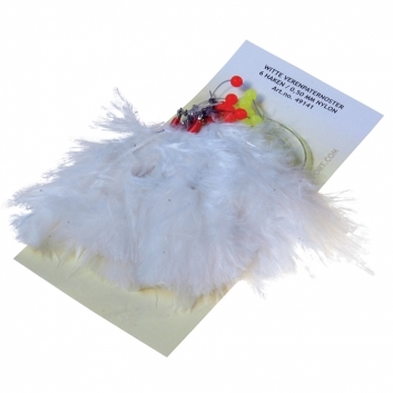 Onder alle omstandigheden is de Albatros veren paternoster een perfecte vanger.  Voorzien van kralen voor extra aantrekkingskracht en is goed geknoopt en uitgevoerd met 6 stevige en vlijmscherpe haken. Voorzien van twee lussen voor bevestiging van lood en  wartel.
